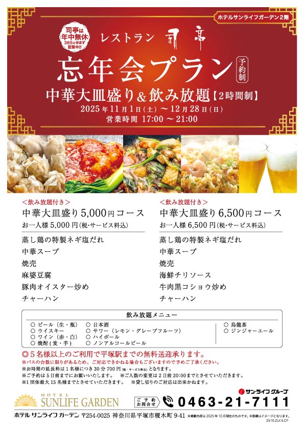 新登場【レストラン司亭】忘年会プラン 中華大皿盛り&飲放題プラン