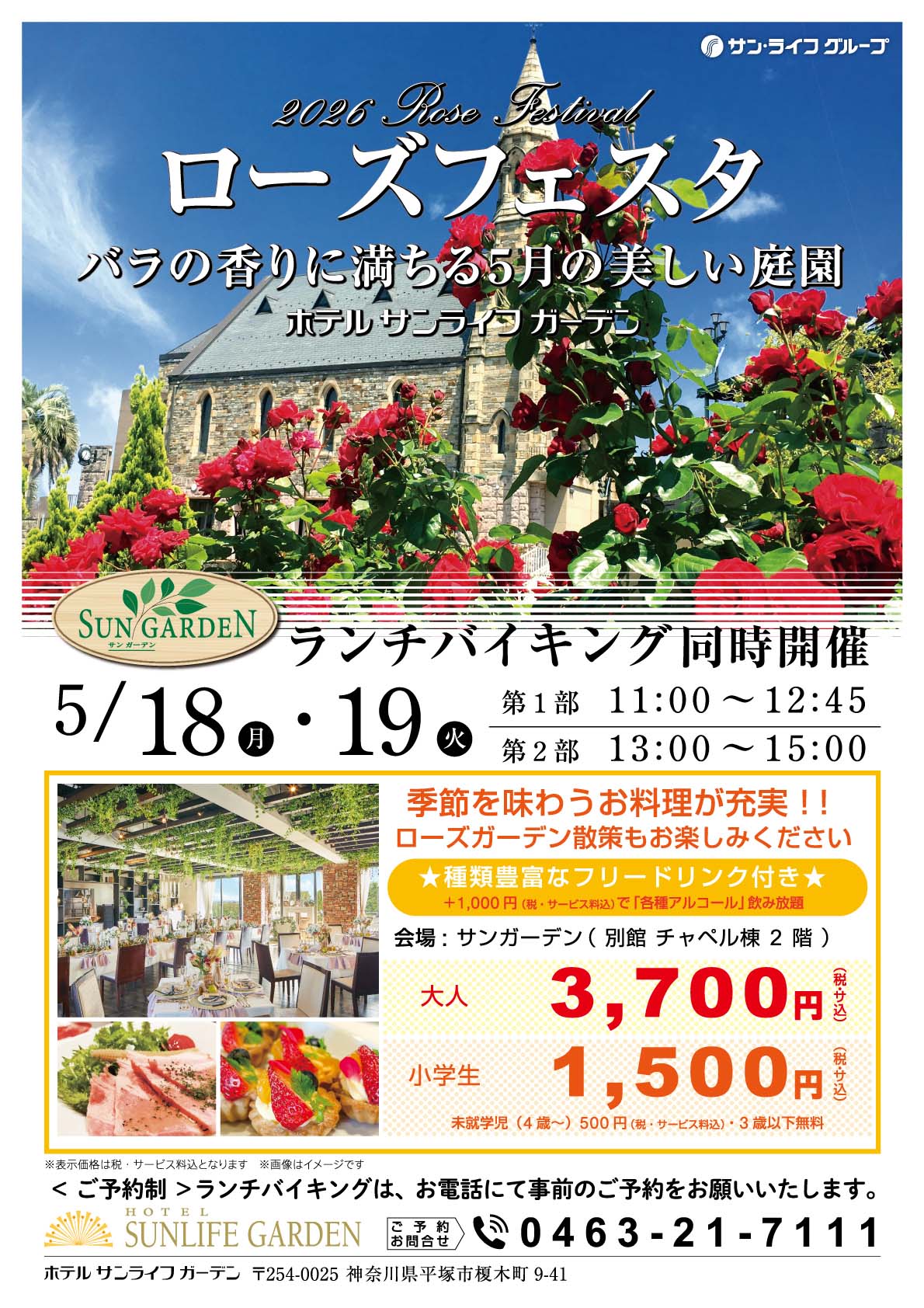 そして、大人気“ランチバイキング”(事前予約制)がローズフェスタの2日間とも開催いたします。